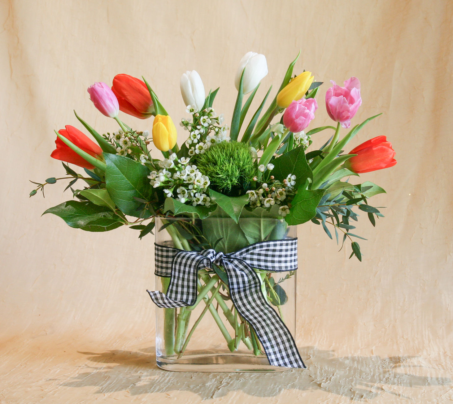 This lovely spring arrangement highlights 10 assorted tulips designed together in a modern vessel. Colors may differ depending on availability